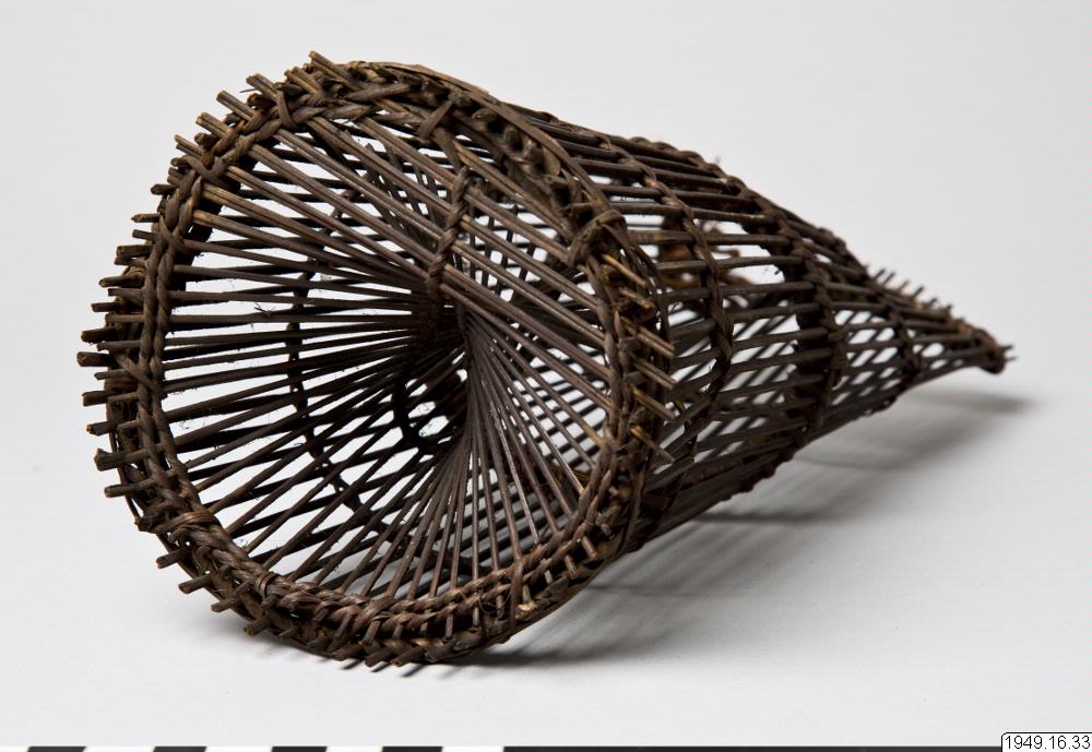 Fiskfälla av tunnt spjälverk. Shokwe: músho. Mörknat.