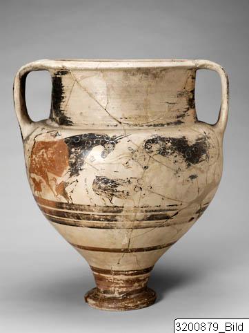 - Amphoroid crater. Disc base; incised signs on base and handle consisting of three horizontal strokes crossed by vertical line and horizontal and vertical line on other handle; piriform body; wide, concave neck; sloping rim; wide, flat handles from rim to shoulder. Hard buff clay; lustrous buff slip; lustrous orange-red to black paint; matt light buff details. Base painted, bands encircling lower and mid body. Frieze encircling shoulder and upper body: on each side there are two big bulls facing each other with one small bull below; bulls surrounded by birds, hatched lozenges, lozenges filled with dots and filled lozenges. All bulls are covered with paint except from legs who are decorated with horizontal strokes or no decoration at all; dots or dotted rosettes on paint; long horns and four of them with raised tails; birds painted except the biggest who is decorated with lines.