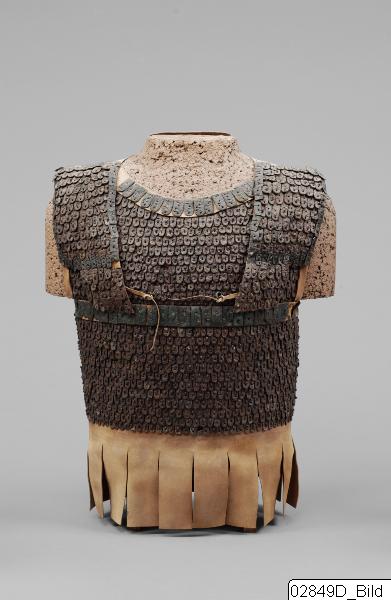 Reconstructed armour consisting of 6800 iron splints of five different types; all scale-shaped with straight long sides and pierced. The splints were arranged in overlapping horizontal rows; the splints in each row also overlap. The short rounded ends of the splints were turned down.