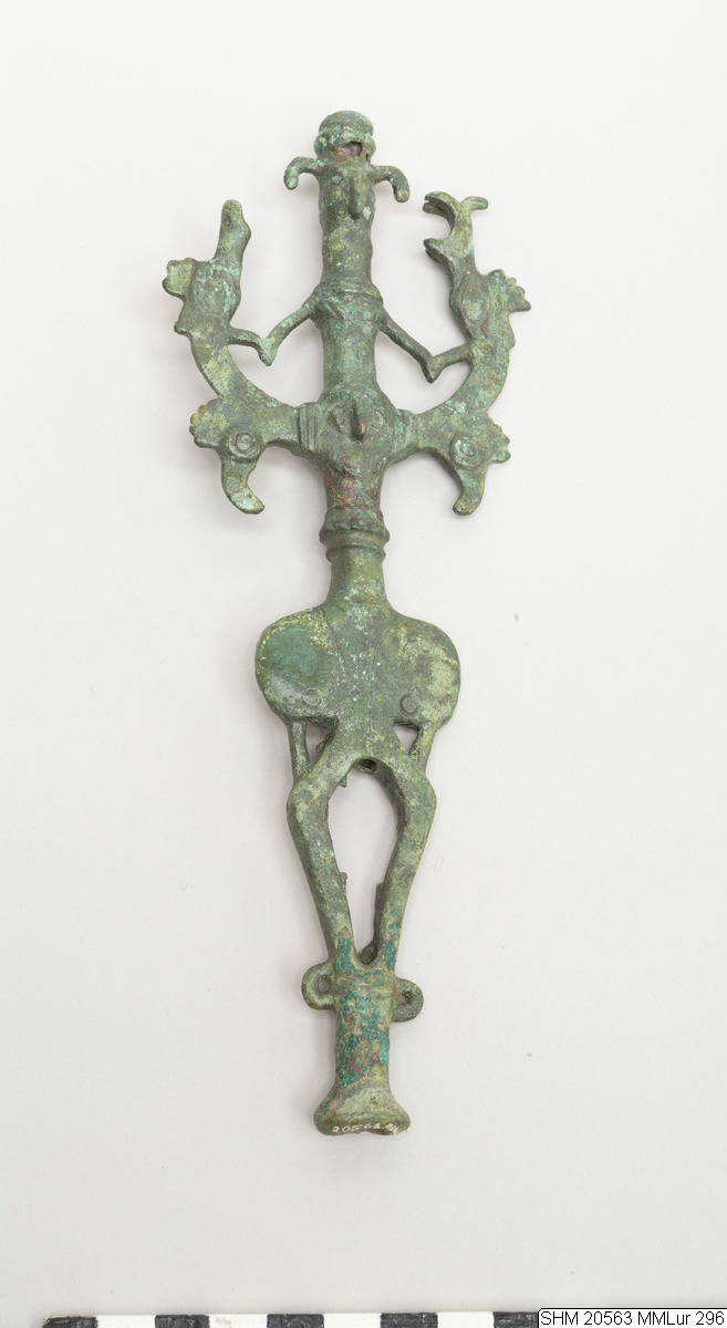 - Cast. Master of animals: anthropomorphic tube flanked by rampant animals. Two human faces on the tube, one at the top with "turban" (three ringed moulding) and large droop ears, and one at the center, both with prominent noses. Central figure with spindly arms sharply bent at elbows grasps the necks of the flanking beasts. Decor: double band necklace for top figure, double ridged moulding flares outward at waist of second figure. Beasts have long branching snouts (one broken), roosters' combs, long curving necks, and at the “elbows” pendant roosters' heads with downward curving beaks. Plain haunches, long tails curved over into loops at bottom / three rings around shaft for feet? Long base widens at bottom.