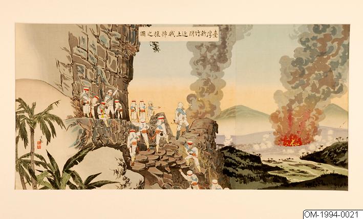 Titel: De japanska trupperna segrar över rebellerna nära Hsinchu på Taiwan (Taiwan Shinchiku fukin dozoku sôjô no zu / Japanese Forces Sweep Out Rebels near Hsinchu in Taiwan)