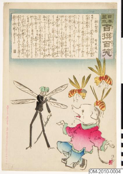 Propagandaträsnitt mot Kina i samband med Sino-japanska kriget (1894–1895). Serien innehåller längre textstycken skrivna av Koppi Dojin (”Mästare skinn och ben”, pseudonym för Nishimori Takeki, 1861–1913). Ur donation av Jan Myrdal, för mer om bilderna se publikationen De hundra skratten: japanska träsnitt som maktens bildspråk av Lars Vargö och Jan Myrdal (inledning av Petra Holmberg). 2011.