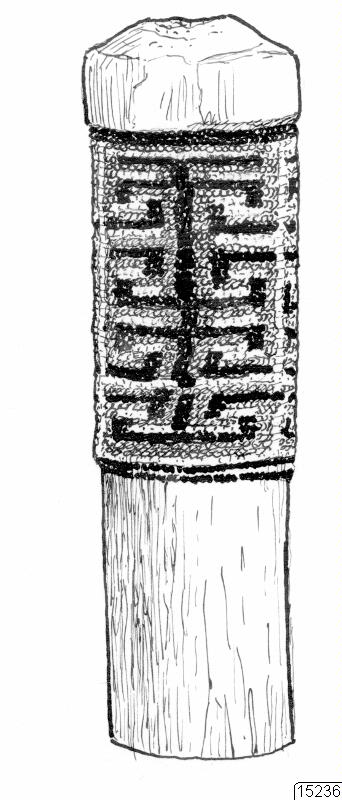 Hayans använder uttrycket "un winis" dd.v.s. han har spanskt pluralis -s på wini ordet för glaspärla vars korrekta pluralis är winmala. Ben prydnaden har här lindats på ett 20 cm runt stycke av balsaved. Ur Hayans orginalkatalog: "Un winis que se usan las mujeres cunas en ambas piernas, son debujados en distintos colores, hecho en Ustupu". (katalogkort/originalbeskrivning)