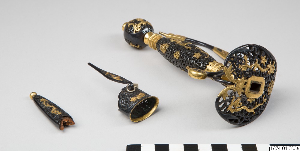 Dessa delar till en värja uppvisar en speciell blandning mellan västerländskt och japanskt. Grundformen är europeisk och alltså avsedd för en värja och inte ett japanskt svärd, men ytdekoren, designen, är japansk. Detta innebär genombrutet slingrande mönster, dekor av drakar, blommor och svastika. Föremålet behöver undersökas närmare och jämföras med andra för att slutsatser ska kunna dras, en misstanke är att föremålen kan ha varit beställde av en europé i Japan. Då research gjordes 1993 inför en Thunberg-utställning på Etnografiska museet tog jag kontakt med Armémuseum, där kollegor inte hade sett något liknande just dessa. /PH