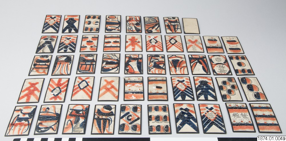 Förlagan till kortleken som reproducerats är en kortlek från vår samling. Den är en av världens äldsta bevarade japanska kortlekar. Den togs till Sverige på 1770-talet av en lärjunge till Carl von Linné som hette Carl Peter Thunberg, som köpte den under en resa. Medan hans skepp låg och väntade på gynnsamma vindar på väg från Nagasaki till Edo kom han närmre den japanska besättningen än vad som var vanligt. Han fick se hur de spelade kort, vilket han inte hade sett några japaner i land göra.