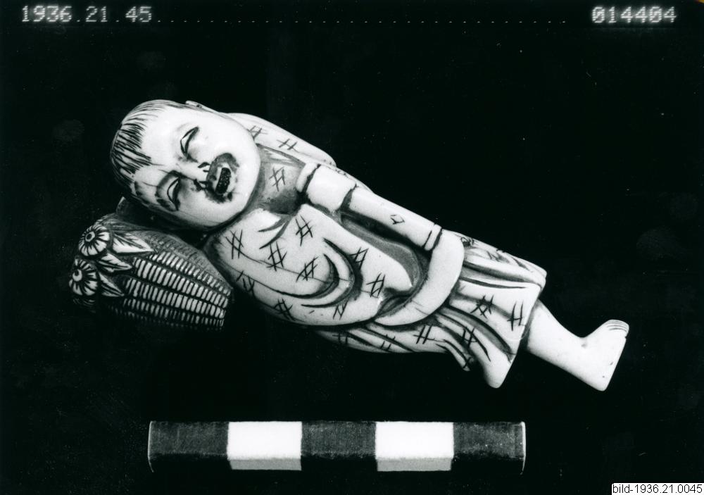 Miniatyrskulpturerna, ofta kallade bältesknappar, (netsuke) rymmer en hel värld att utforska. Myter är ett stort motiv. Ofta var designen lyckobringande och inte minst underhållande.