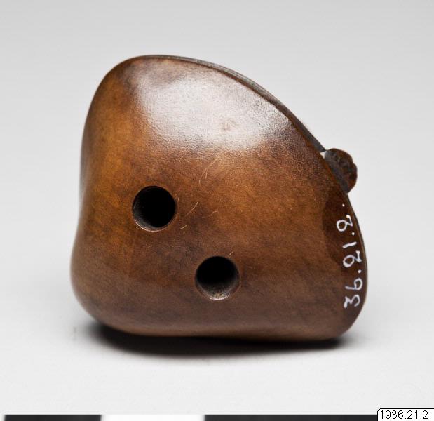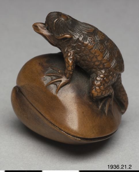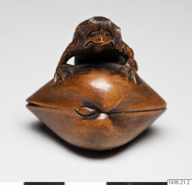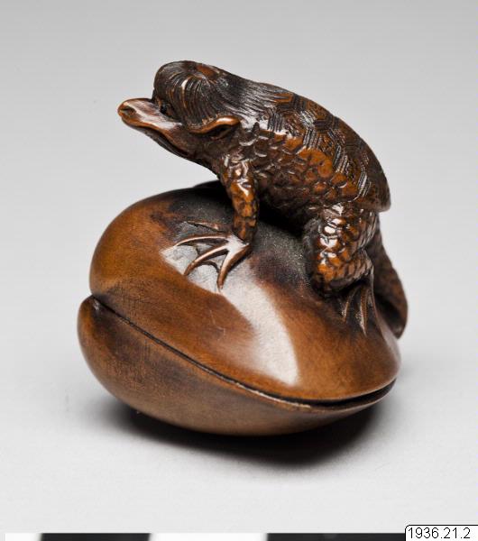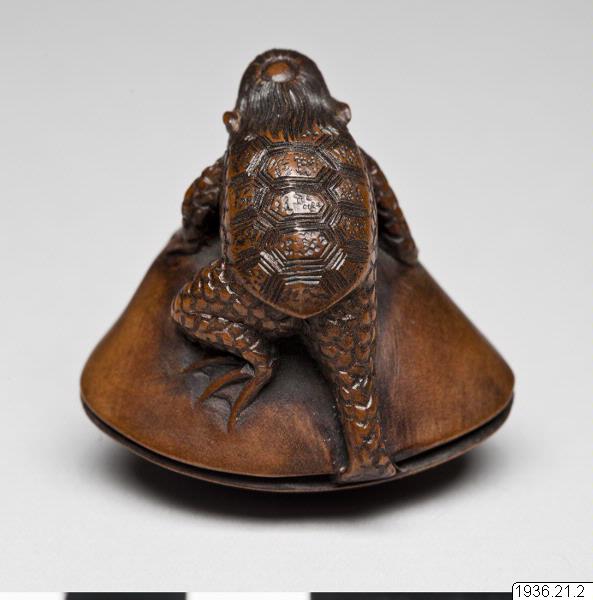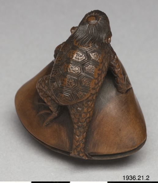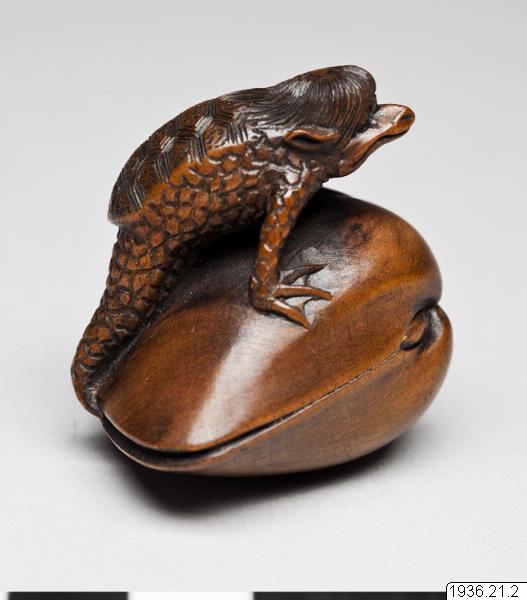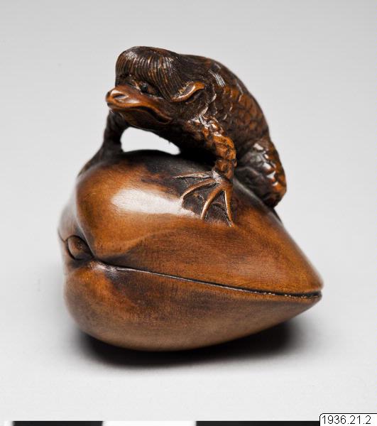 Netsuke av trä. Det mytologiska djuret "kappa" med sin livselixirbehållare (vattenskål) på hjässan som kliver upp på en mussla. Troligen ny. Inte signerad. (generalkatalogen)