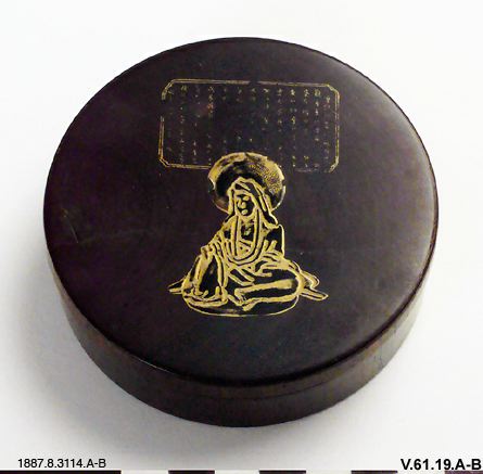 Rökelseask av trä, svarvad, svartlackerad. Inuti lackerad brun. På locket en sittande buddhistisk gudomlighet samt en inskriptionstavla i guldlack. Uppges vara från 1400-talet. "Jfr utställningen av Japansk konst, nov 1931" (generalkatalogen)