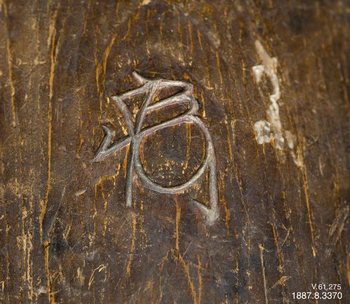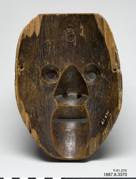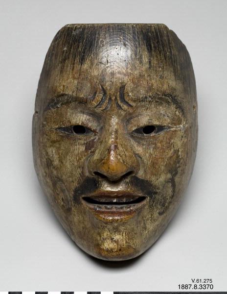 Skådespelarmask. Ansikte utan skägg. Endast rester av färg. Föreställer Chu-jo, en högre officer. Någon gång kallas masken Waka-Otoko, en ung man. 1600-talet. Inskuren signatur. (Generalkatalogen)