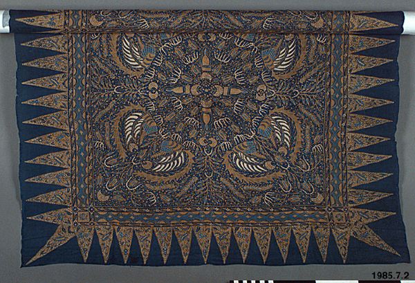 Blå bakgrund med mönster i vitt och brunt. Det bruna från barken av sogaträdet Peltophorum Pterocarpum. Kantmotiv: yttre bård, trekanter i s.k. tumpal motiv, inre bård blomrankor på ömse sidor om rombformade ornament s.k. mlinjo motiv. Centralmönster: växtrankor, s.k. semenmotiv med fågelvingar, s.k. sawatmotiv och små fåglar.