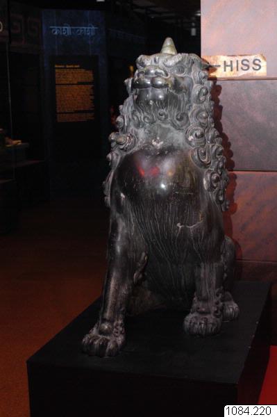 Enligt kataloguppgift markerar den hornliknande upphöjningen på huvudet att det är den manliga parten av ett par väktarlejon. Som vanligt i japansk konst har hanen gapet slutet, då han avbildas i en inandning. Detta lejonpar har antagligen varit placerat som väktare vid ingången till ett tempel eller ett palats. Hanen har då sin plats till vänster, honan till höger./CR (Uppgifter från generalkatalogen). Citat ur d:o: "År 1939 uppställdes lejonen på socklar av sten på museiområdet (byggnaderna 3 och 4). Socklar och uppställning bekostades av hovjuvelerare K. Andersson med maka." (PH)