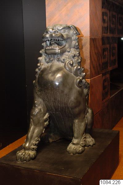 Enligt kataloguppgift är detta den kvinnliga parten av ett par väktarlejon. Honan har gapet öppet, då hon avbildas i en utandning. Detta lejonpar har antagligen varit placerat som väktare vid ingången till ett tempel eller ett palats. Hanen har då sin plats till vänster, honan till höger. /CR (Uppgifter från generalkatalogen). Citat ur d:o: "År 1939 uppställdes lejonen på socklar av sten på museiområdet (byggnaderna 3 och 4). Socklar och uppställning bekostades av hovjuvelerare K. Andersson med maka." (PH)