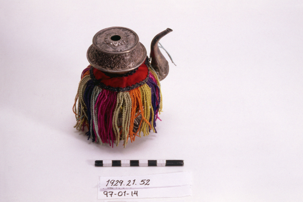 Kannan är försedd med en kjol av brunt och rött tyg från vilken det hänger trådar i gult, ljust och mörkt blått, lila och orange. (AA)