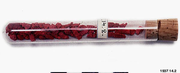 Enligt kataloguppgift ett rödlila pulver, "Jan Tji mi", att användas för magsmärtor.