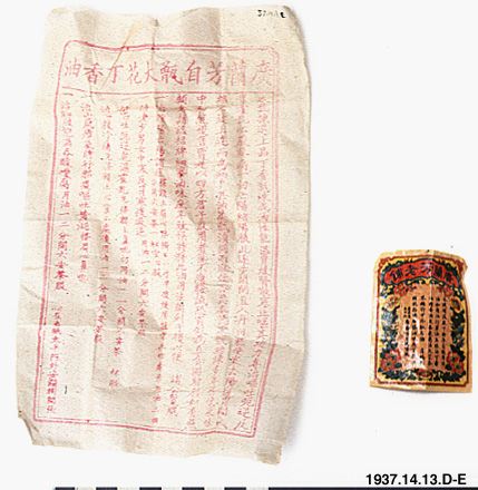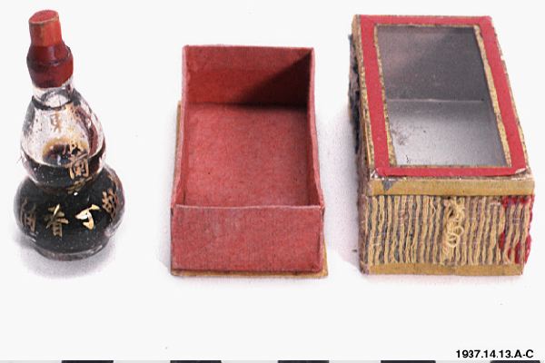 Ask med liten glasflaska med kinesiska tecken, innehållande en brun lättflytande vätska, samt tillhörande papper med text och anteckningen "för hosta" skrivet på.