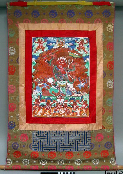 - Tempelfana med bemålad mittsektion på bomullsväv - avbildning av rött monster på häst (Djamsering). Bård av sidenbrokad med röd, grön, blå, rosa blommor o swastikor. Rosa o gula innerbårder. Lapp under måleri med geom. mönster i guld o blått. Rött bomullsfoder, och gult o rött sidenförhänge. Tunn ribba i överkant, rundstav i nederkant.