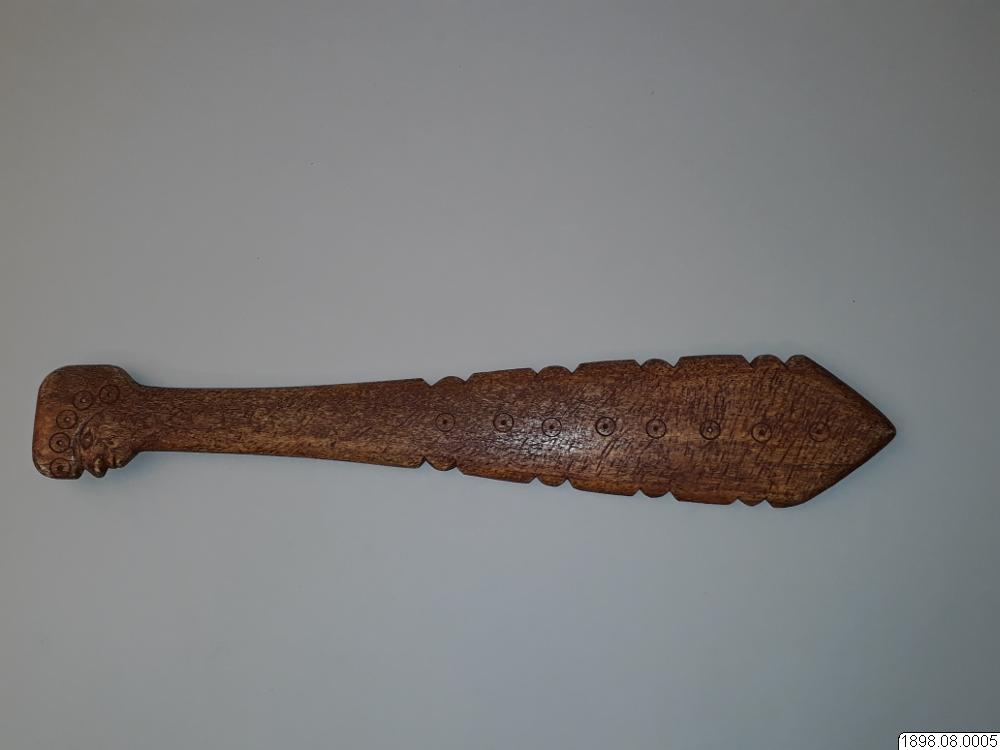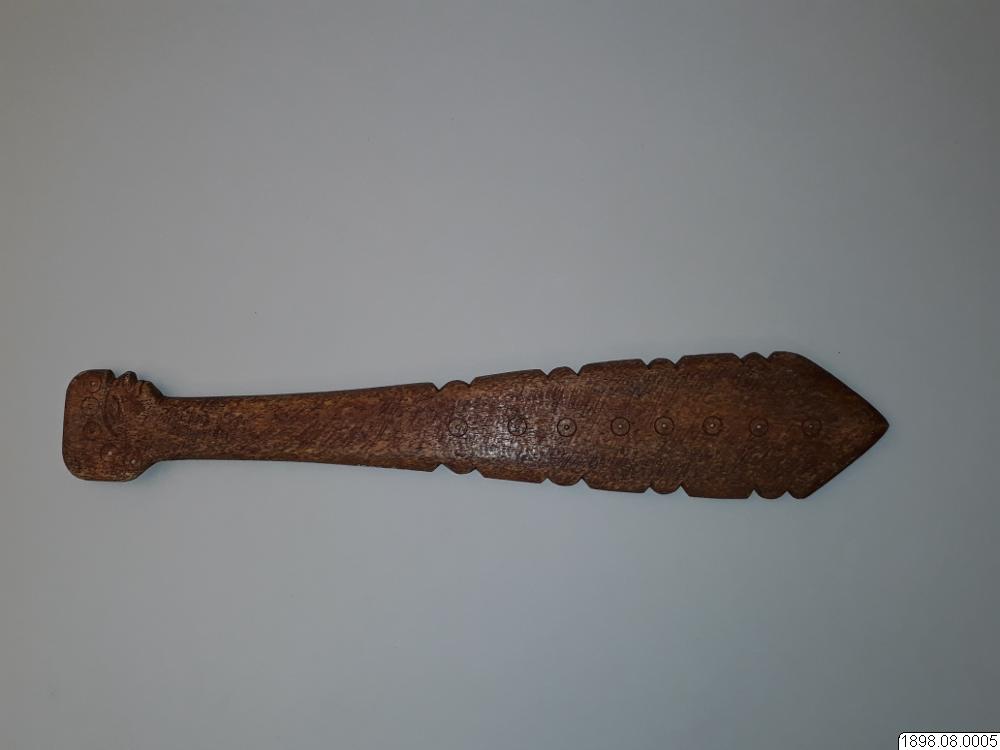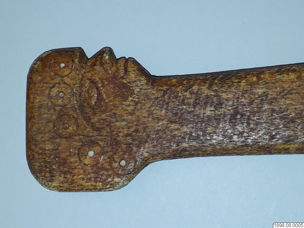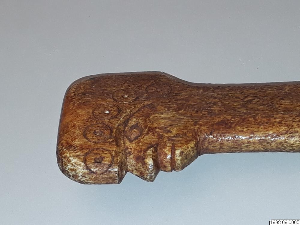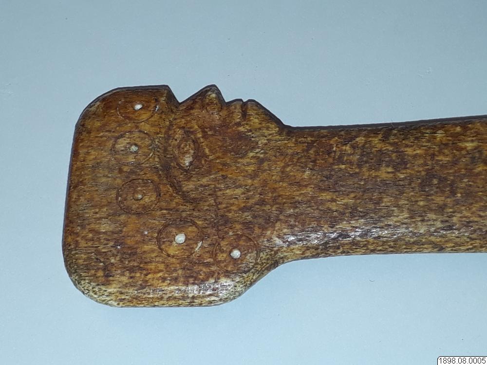 Troligen rör det sig om en turistprodukt eller en förfalskning som sålts som äkta. Enligt generalkatalogen är det ett redskap av ben med proveniensen British Columbia. Om föremålet är av indiansk tillverkning eller ej kan ej avgöras. Klubban kan också ha tillverkats av Nuu-chah-nulthindianer som ett exempel på de valbensklubbor som tidigare användes, innan den vita kulturkontakten.