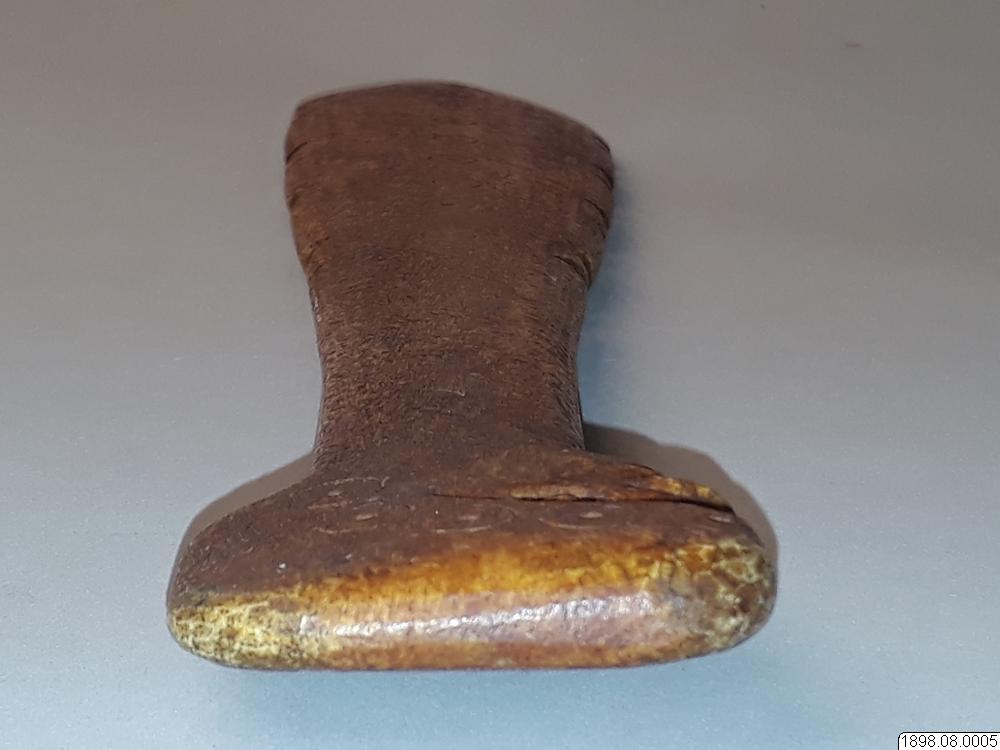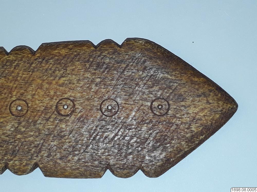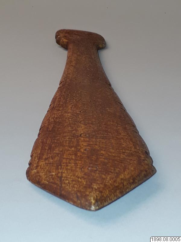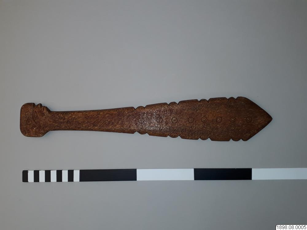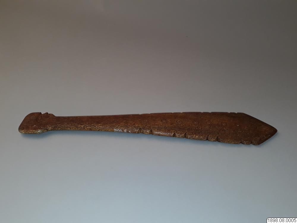 Troligen rör det sig om en turistprodukt eller en förfalskning som sålts som äkta. Enligt generalkatalogen är det ett redskap av ben med proveniensen British Columbia. Om föremålet är av indiansk tillverkning eller ej kan ej avgöras. Klubban kan också ha tillverkats av Nuu-chah-nulthindianer som ett exempel på de valbensklubbor som tidigare användes, innan den vita kulturkontakten.