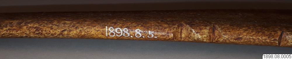 1898.8.5 är med stor säkerhet en sent utförd kopia av en gammal valbensklubba. Stilen skiljer sig helt från originalen. Klubban verkar också vara avsiktligt patinerad med någon form av brunröd färg. Under denna färg skymtar vitt omålat valben fram här och var. Klubban är också dekorerad med runda ringar med ett runt hål i mitten. Dessa ringar med hål är så exakta att det tydligt syns att de är maskinellt tillverkade. I dessa hål i ringarna, ses det vita valbenet tydligt, här har patineringsfärgen ej trängt ned. Ansiktet vid handtaget på klubban liknar ej heller de som finns på originalklubborna. Ögats utformning är tex mycket olikt originalens.