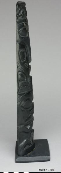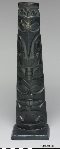 Enligt generalkatalogen är detta en, totempåle av svart skiffer, med proveniensen British Columbia.