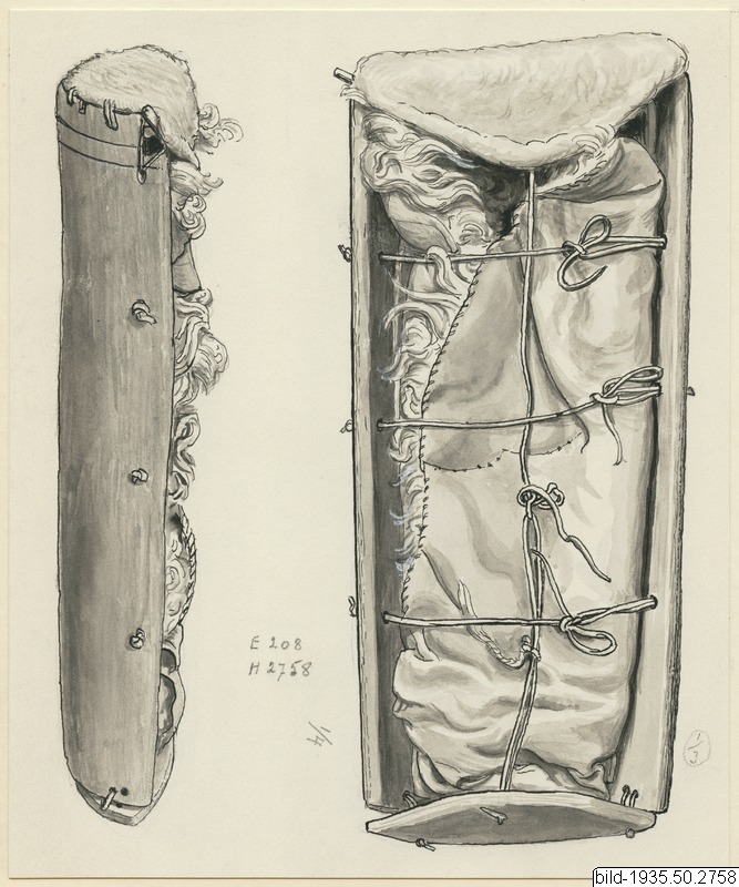 - Vagga med trästomme med huvudändan täckt med filtad ull, samt med ull i botten och ovanpå ett ullpälsstycke att lägga barnet i. Trästommen ihopknuten med skinnremsor. Skinnremsor knyts även i trästommen över pälsen/barnet som skydd, samt ett hängband av skinnremsor mellan gavelträstycke och filtad gavel. Trästommen ihopknuten med skinnremsor.