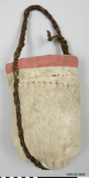Väska av tovad ull, med en övre kant av rött tyg, och handtag av tvinnat mörkbrunt hår. (AA)