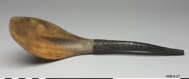 Sked av horn. Sammansatt av två delar. Eventuellt är skedens material här både snögetshorn och bergsgetshorn, men det kan ej fullständigt fastställas. Skaftet är av grunt snidat snögetshorn och skedbladet kan vara av ljusare bergsfårshorn. Enligt generalkatalogen är detta en, stor sked av ljust horn med svart snidat träskaft, snideriet grunt. Längd 30cm, med proveniensen British Columbia. Skeden är i ett relativt gott originalskick. Skedens delar är sammanfogade med metallnitar varav en förefaller vara av koppar. Proveniensen är troligen Haida men kan ev. också vara någon av de övriga nordliga grupperna.