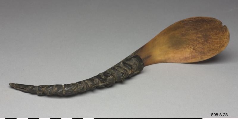 Sked av horn. Sammansatt av två delar. Eventuellt är skedens material här både snögetshorn och bergsetshorn, men det kan ej fullständigt fastställas. Skaftet är av snidat snögetshorn och skedbladet kan vara av ljusare bergsfårshorn. Enligt generalkatalogen är detta en, mindre sked av ljust horn med skaft av svart snidat trä, snideriet kraftigt. Längd 23cm. , med proveniensen British Columbia. Skedens skaft är vackert skulpterat men i dåligt skick, där främst de nedre figurerna är skadade med vissa avbrutna bitar.