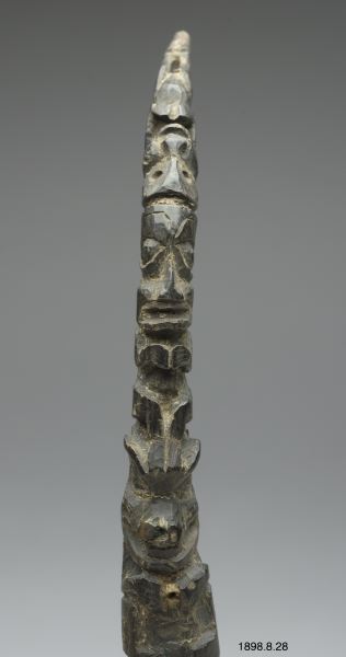 Stilen är typisk för Haida, men skeden kan också ha tillverkats av någon av de övriga nordliga lingvistiska grupperna vars konststil är snarlik Haidas. Hornskedsämnena kokades i vatten vilket gjorde dem mjuka, och tillät formning och böjning, för att få fram det slutgiltiga utseendet. Skaftets material är inte av trä, vilket alltså felaktigt anges i generalkatalogen./CJG