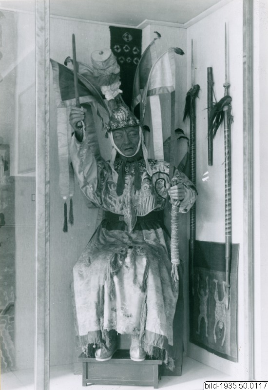 Dräkten är en informell kvinnodräkt (tidigt 1800-tal?) avsedd för en manchu-kvinna. Dräkten har här uppenbarligen kommit till annan använding. Detta förfarande var inte ovanligt - man inkorporerade allehanda kinesiska dräkter i religiösa och ceremoniella sammanhang i Tibet och Mongoliet (t ex teaterdräkten 1935.50.1040 som använts i cham-dansen).