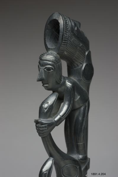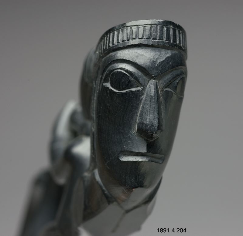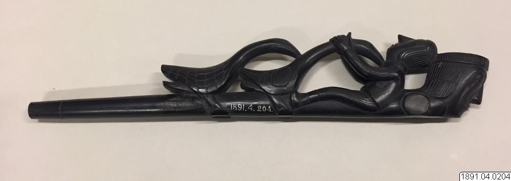 Skulptur i argillit i form av en tobakspipa. En typisk argillitpipa från haida som kan ha använts till rökning. Pipan är av väsentligt nyare modell än 1904.19.411, och har mer västerländskt inspirerade figurer. Motivet är människor och fåglar.
