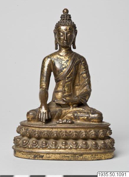 Shakyamuni och Akshobhya avbildas båda i denna ställning, men vajran på tronen framför den avbildade tyder på att det i detta fall är Akshobhya som har avbildats. (AA, Litteratur: Bruxelles L. 1970. s.34)