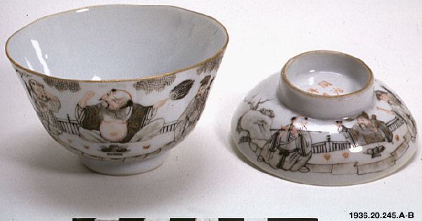 Tekopp med lock av porslin dekorerad med figurscener i emaljfärg. I botten finns en stämpel, liksom på lockets översida.