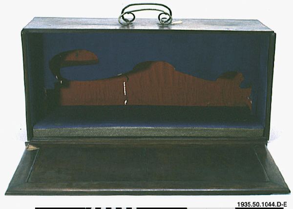 De båda ruyi-spirorna och stället ryms i en låda av trä som är uppbyggd inuti, så att delarna passar på sin givna plats. Lådan är invändigt klädd med rött och blått siden. Lådan stängs med ett skjutbart lock av trä som invändigt är klätt med rött siden. Lådan är försedd med mässingshandtag. (AA)