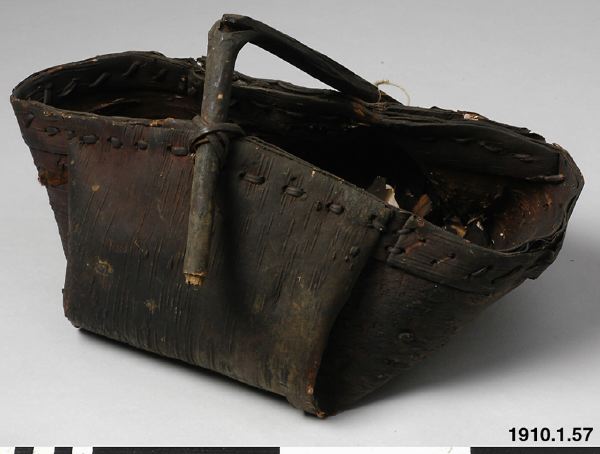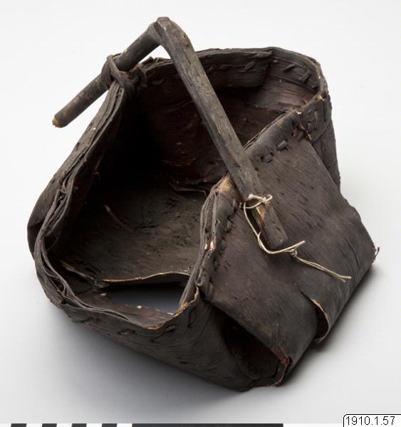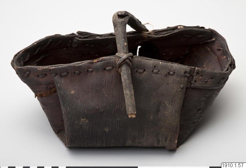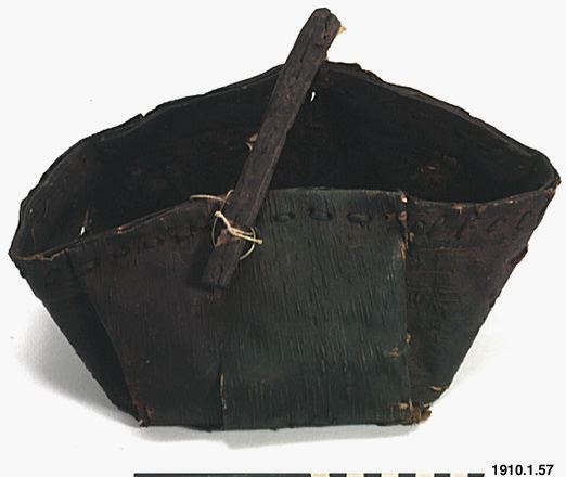 Korg av näver (skadad i botten) med handtag av trä. Enligt katalogen av björknäver och betecknas "Sarani."