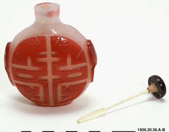 - Stor snusflaska av glas i s.k. överfångsteknik. Motivet utgörs av två stiliserade shou-tecken i rött glas utanpå flaskan av opakt vitt glas. Snussleven är av ben med glasknopp. Svårbestämd ålder.