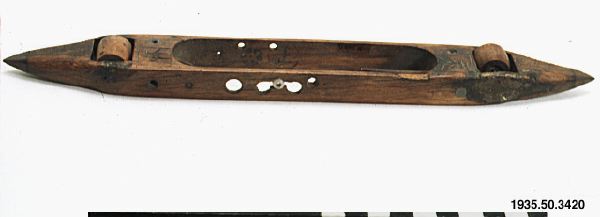"Vävskyttel av trä på två rullar, anv. endast i stora vävstolar." (MLK)