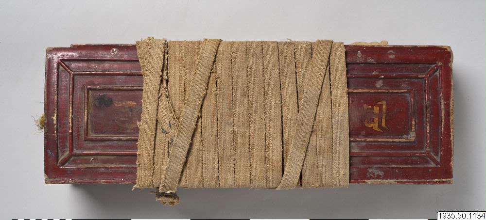 Bok med rödmålade pärmar av trä, försedda med skrift i guldfärg. Omslag av tyg som i nuvarande skick är ljusbrunt. Boken är försluten med ett band, vid vilket ett spänne av metall är fäst. Spännet är dekorerat med en vajra. Boken har ej öppnats. (AA)