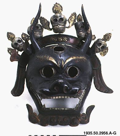 Mask av driven koppar, bemålad. Föreställer Yama.