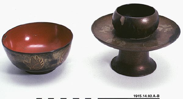 Skålen används vid sakédrickning och båda delarna är tillverkade av japaner, men avsedda för ainu. Ur katalogen: ""En lackerad sakékopp med björnfigur i botten och ställ. Av japansk tillverkning men gjord speciellt för ainus."." samt "Användes till ceremoniell drickning vid björnfesten. Enl. fru Trotzig lik de tekoppar som japanerna använda till téceremonien."
