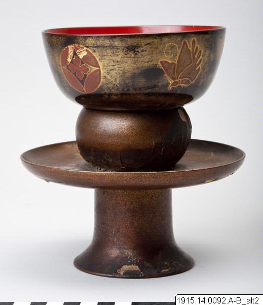 Skål på ställ, av lackerat trä. Skålen har rödlackerad insida och dekor av björn i hiramaki-e (där guldet nästan helt försvunnit så den bruna underfärgen framträder) och på utsidn hiramaik-edekor av olika familjevapen (mon), bl a i form av fjäril. Stället är på insidan svartlackerat och på utsidan nashiji-dekorerat och prytt med fem mon, bl a kiri-mon (paulownia). Japansk tillverkning.