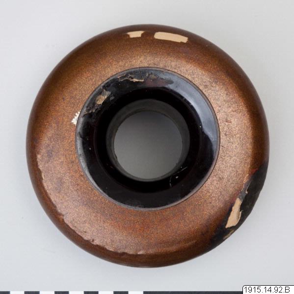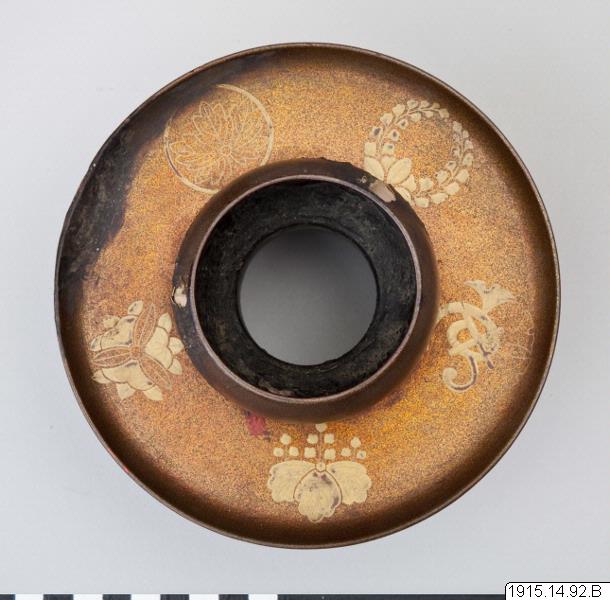 Skål på ställ, av lackerat trä. Skålen har rödlackerad insida och dekor av björn i hiramaki-e (där guldet nästan helt försvunnit så den bruna underfärgen framträder) och på utsidn hiramaik-edekor av olika familjevapen (mon), bl a i form av fjäril. Stället är på insidan svartlackerat och på utsidan nashiji-dekorerat och prytt med fem mon, bl a kiri-mon (paulownia). Japansk tillverkning.
