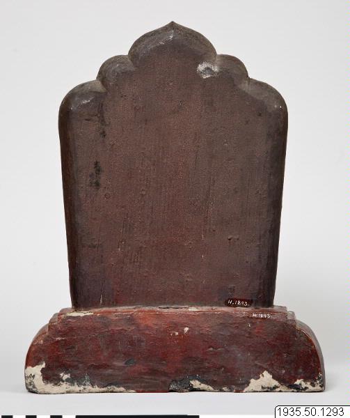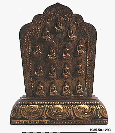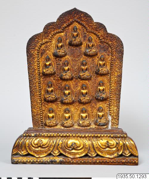 Relief, altarprydnad. Framsidan är täckt med en massa, i vilken rökelseaska ingår. I denna massa äro 15 reliefer av Buddha infattade (Buddha i bhumisparshamudra). Hela ytan är guldlackerad. Plattan är nedsänkt i ett stöd av lergods, framsidans relief nedåtvända lotusblad." (HBE)
