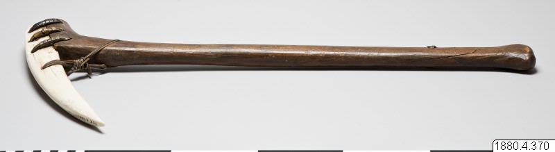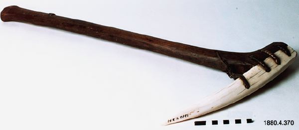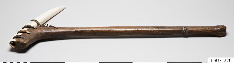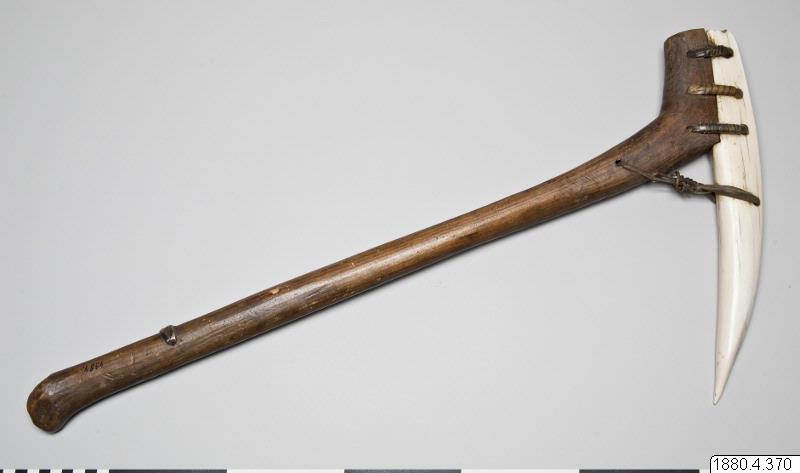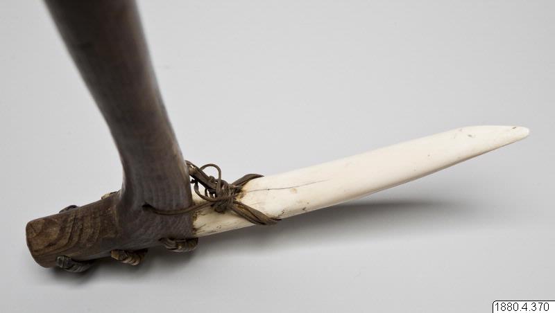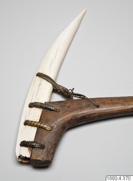 "Består i nedre delen av en valrosstand, fästad genom skinnremmar vid en knäformig utbörjing på ett skaft av trä. Fyra hål genom bladet och skaftet." (generalkatalogen)