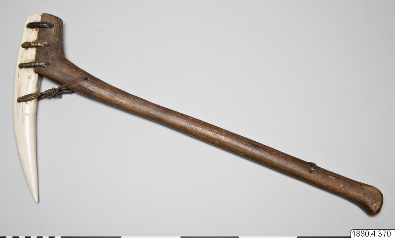"Består i nedre delen av en valrosstand, fästad genom skinnremmar vid en knäformig utbörjing på ett skaft av trä. Fyra hål genom bladet och skaftet." (generalkatalogen)