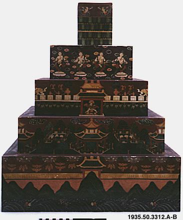 Den översta avsatsen är dekorerad med fyra bårder av stiliserade kronblad av lotus, varannat grönt och varannat blått. Över dessa bårder finns två apsarasas på var sida. Denna avsats är ihålig som en ask och är försedd med lock. Locket är dekorerat med en lotusblomma med åtta kronblad. `Askens´ och lockets insidor är omålade.