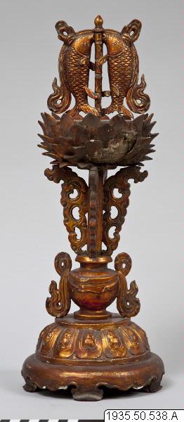 Altaruppsats med åtta pjäser, vilka uppbär de åtta buddhistiska emblemen: tvillingfiskar, vas, lotus, snäcka, evighetsknut, parasoll, hjul och segerbanér. Altarpjäserna är av trä som överdragits med guldlack. Undersidan är rödlackad. Foten har dekorerats med tolv stiliserade kronblad av lotus. Emblemet som föreställer ett hjul är mörkare än de övriga emblemen. (AA)