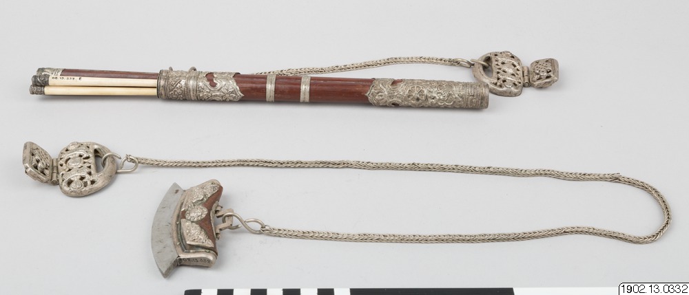 "Knivuppsättning. Kniv och två ätpinnar i fodral av trä med tunna silverbeslag. Förenad med en kedja av silver, ett hängbeslag av samma material.