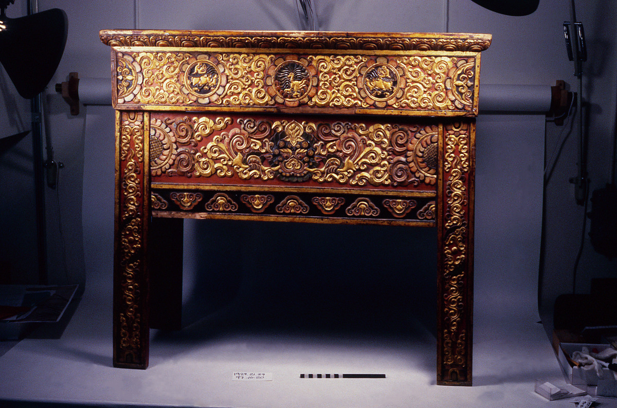 "Taxile´en sjirae, 2 carved wooden altar tables made by Sagetjin Baell Mongols. (2 st) c: Kr. 140.- (Priset inkluderar föremål märkt 40)" (Originalförteckning till samlingen)