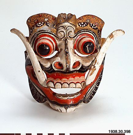 - Mask trä. Föreställer troligen Rangda se föreg. nr. -Demonliknande ansikte med väldiga betar och utskjutande överkäke. Målad i flera färger med-vit som bottenfärg. Vissa partier förgyllda. 21 x 23,5 cm. (K. 247, felmärkt?). Bali.